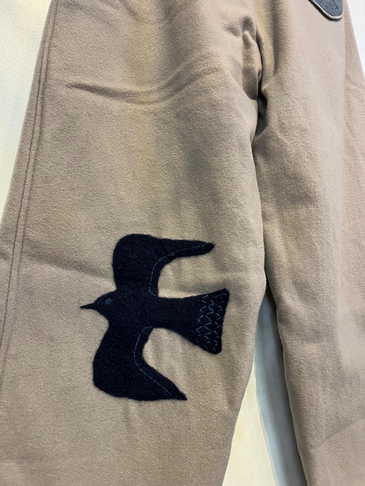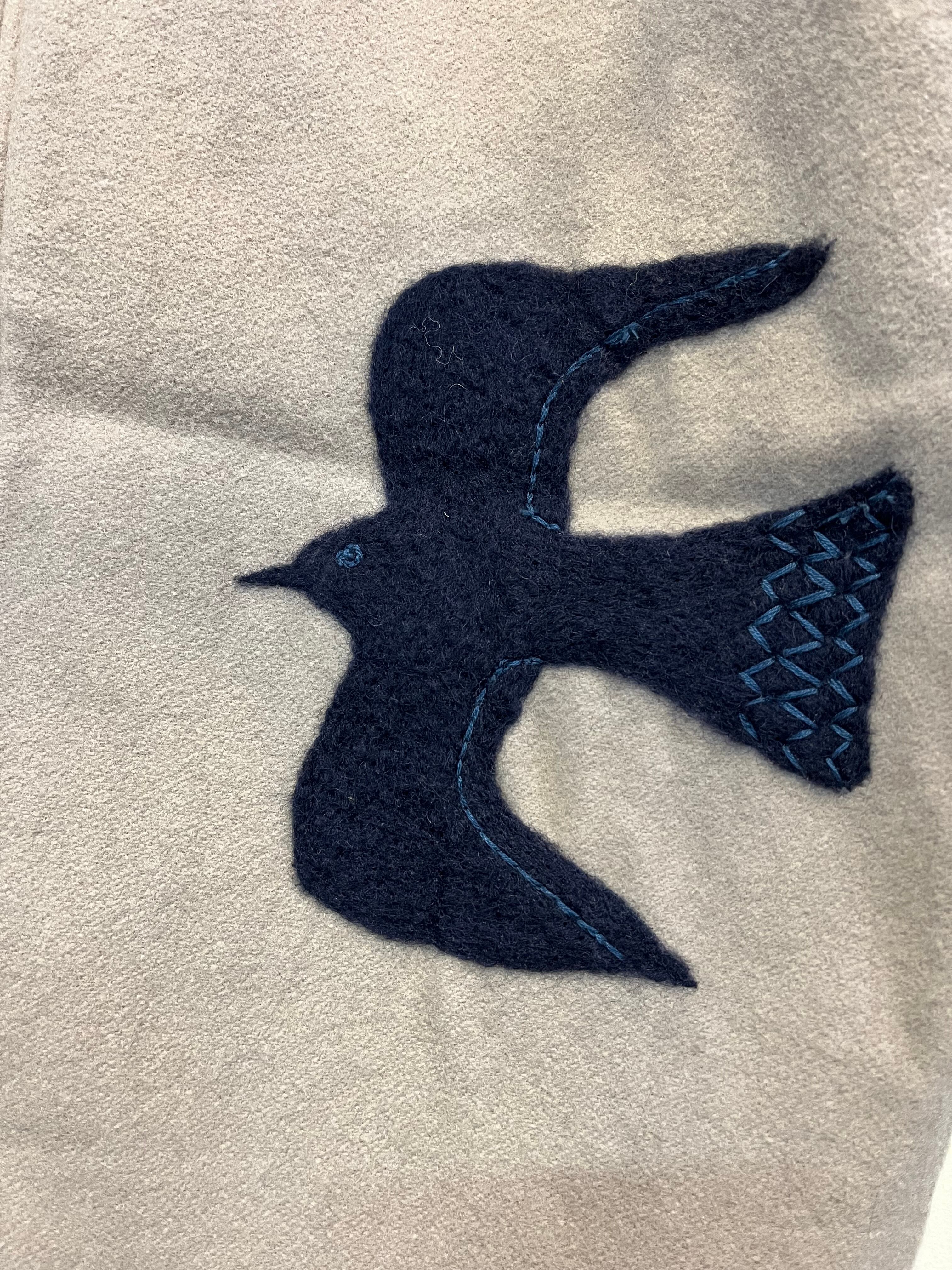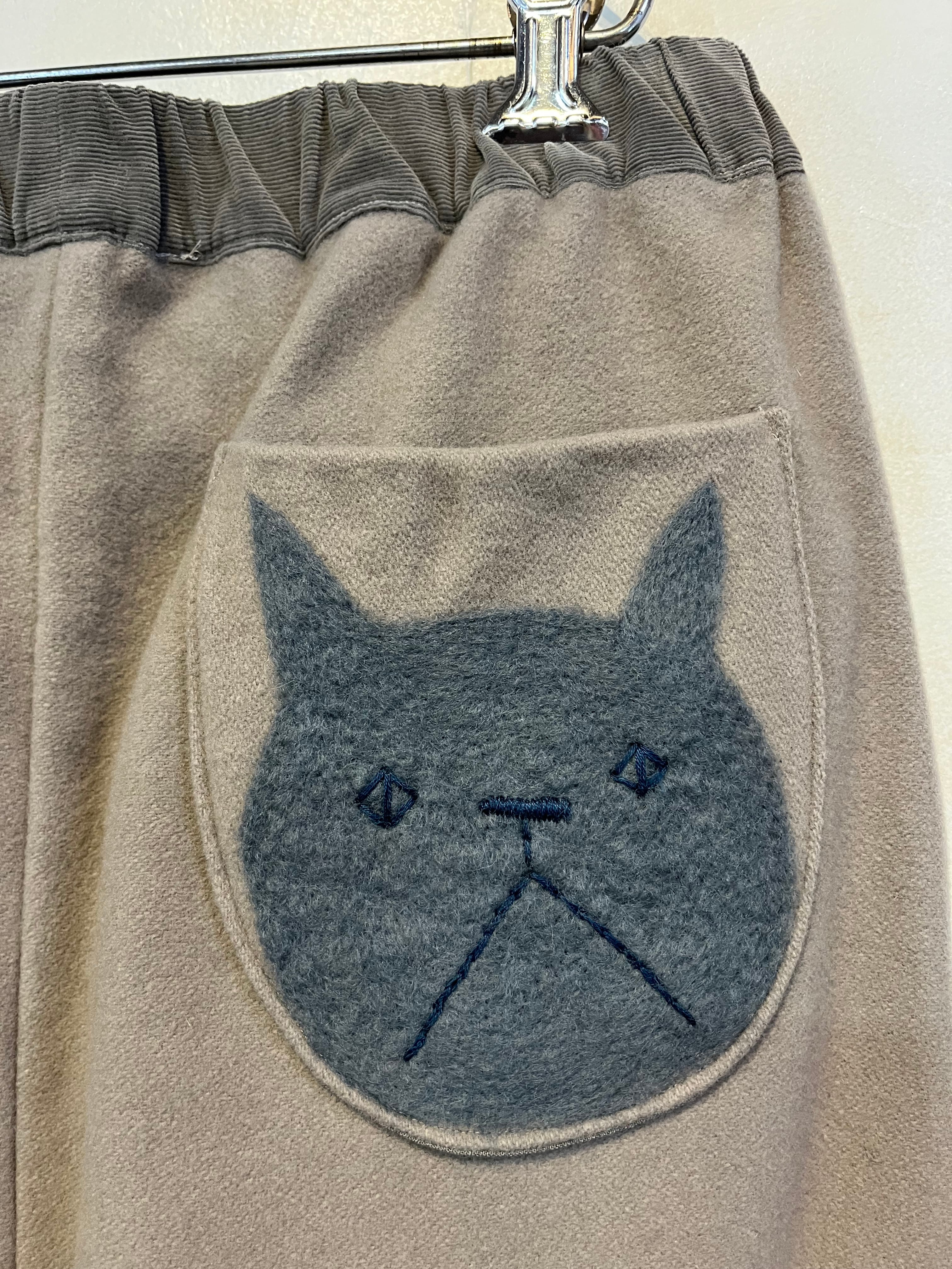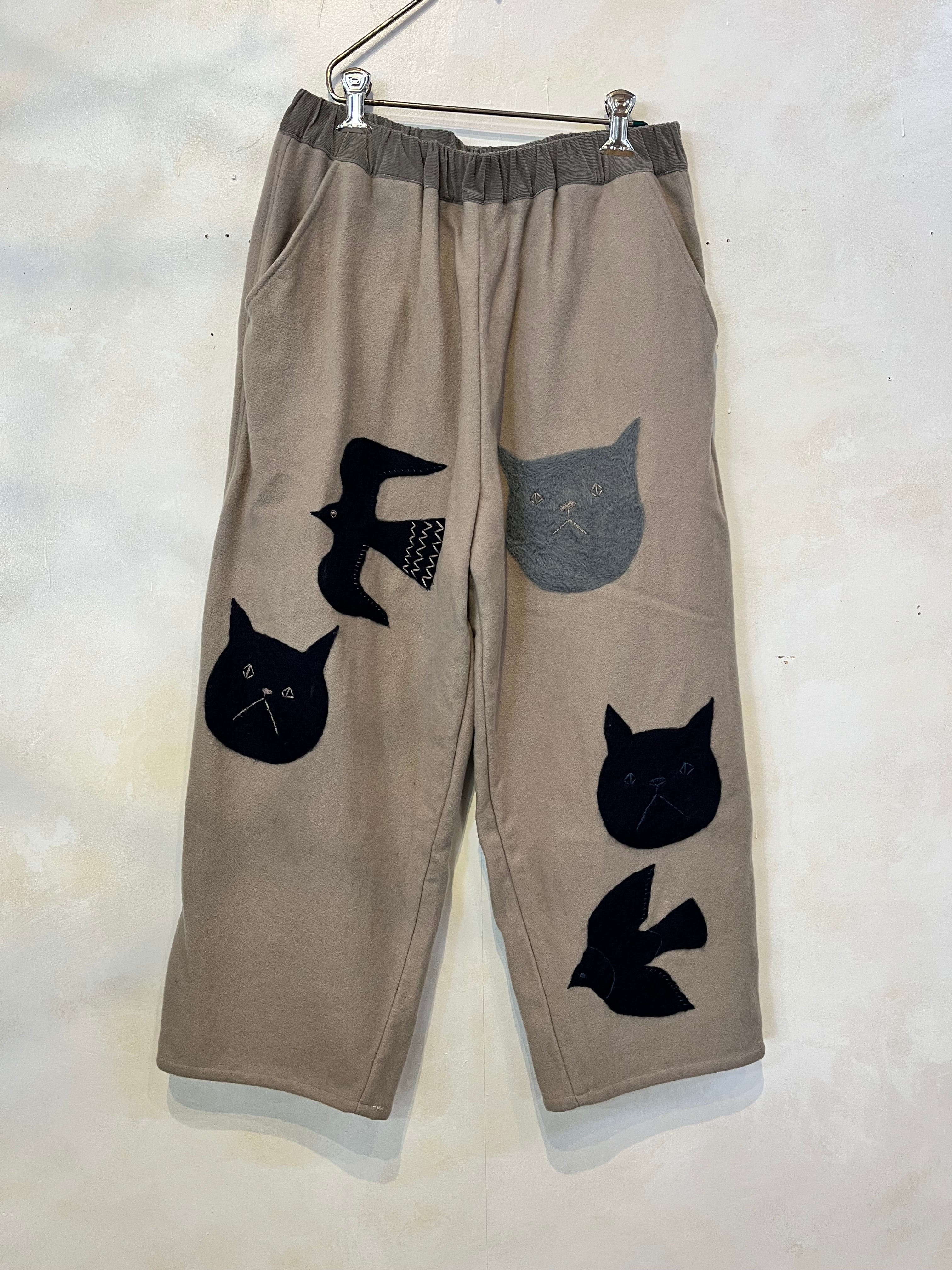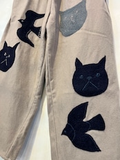 ふかふかとしたフェルト生地に、猫と鳥のイラストをフェルトで描いた、ワイドめストレートパンツです。