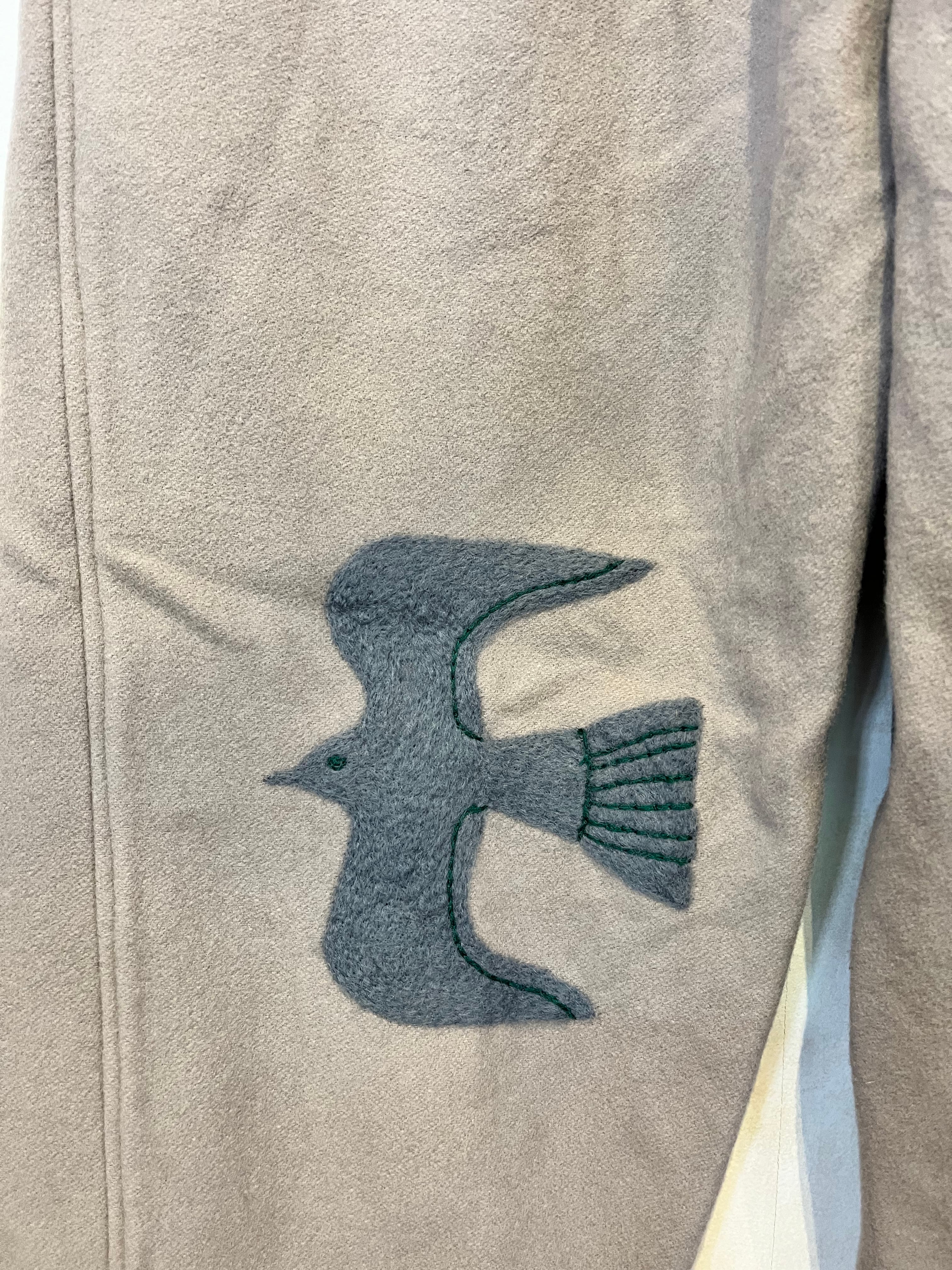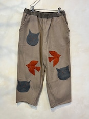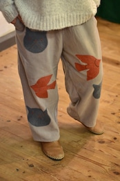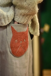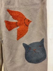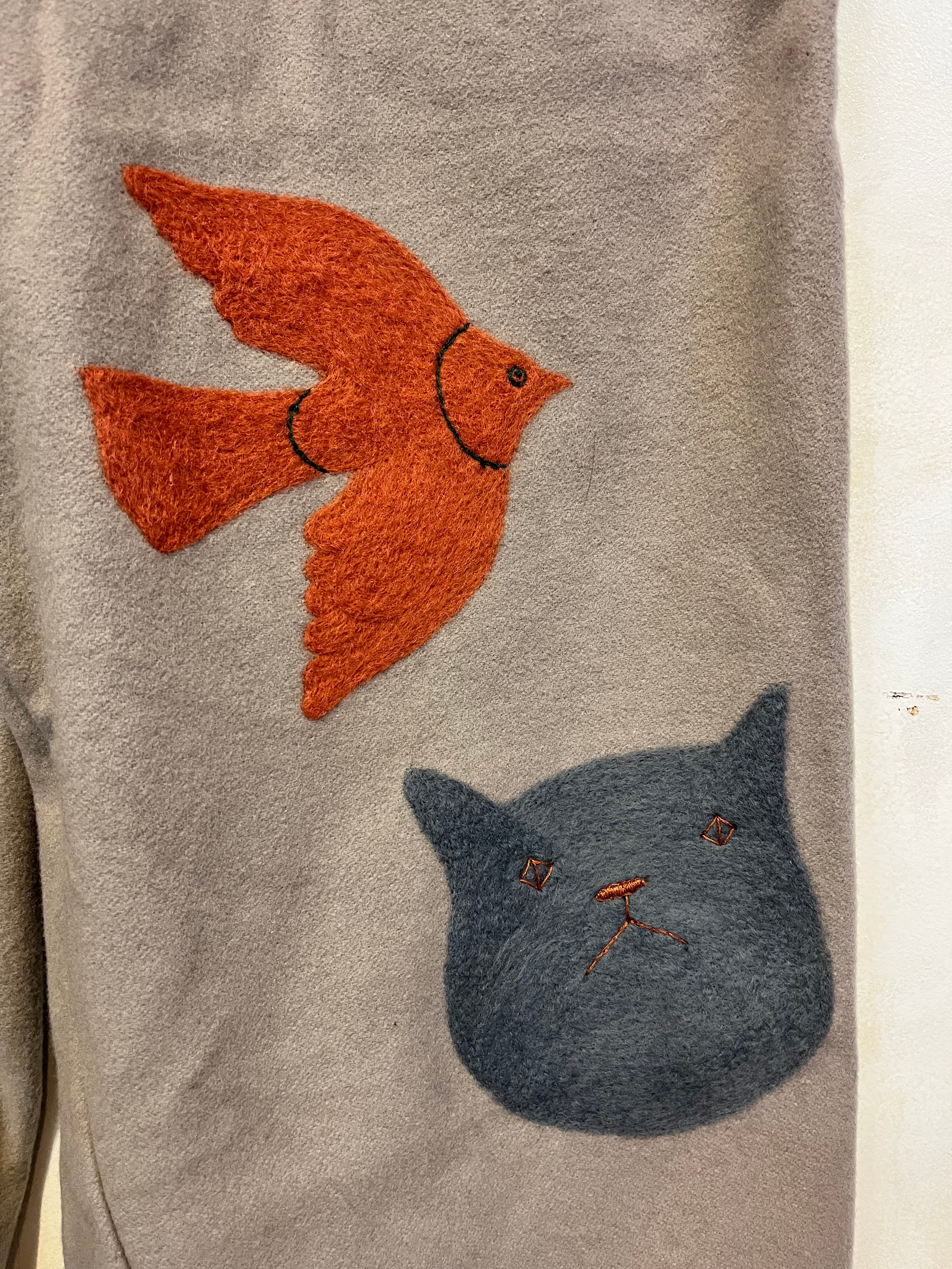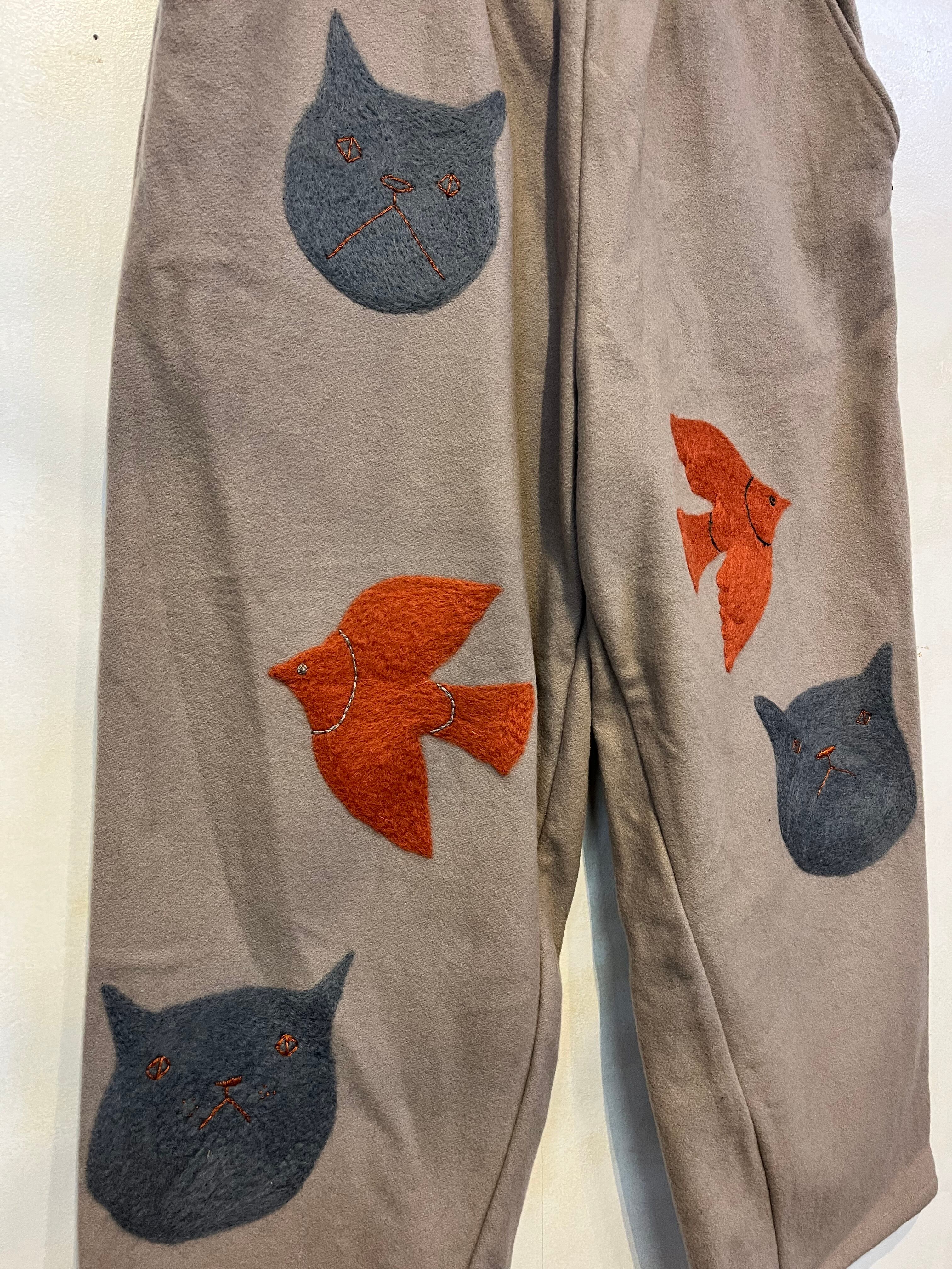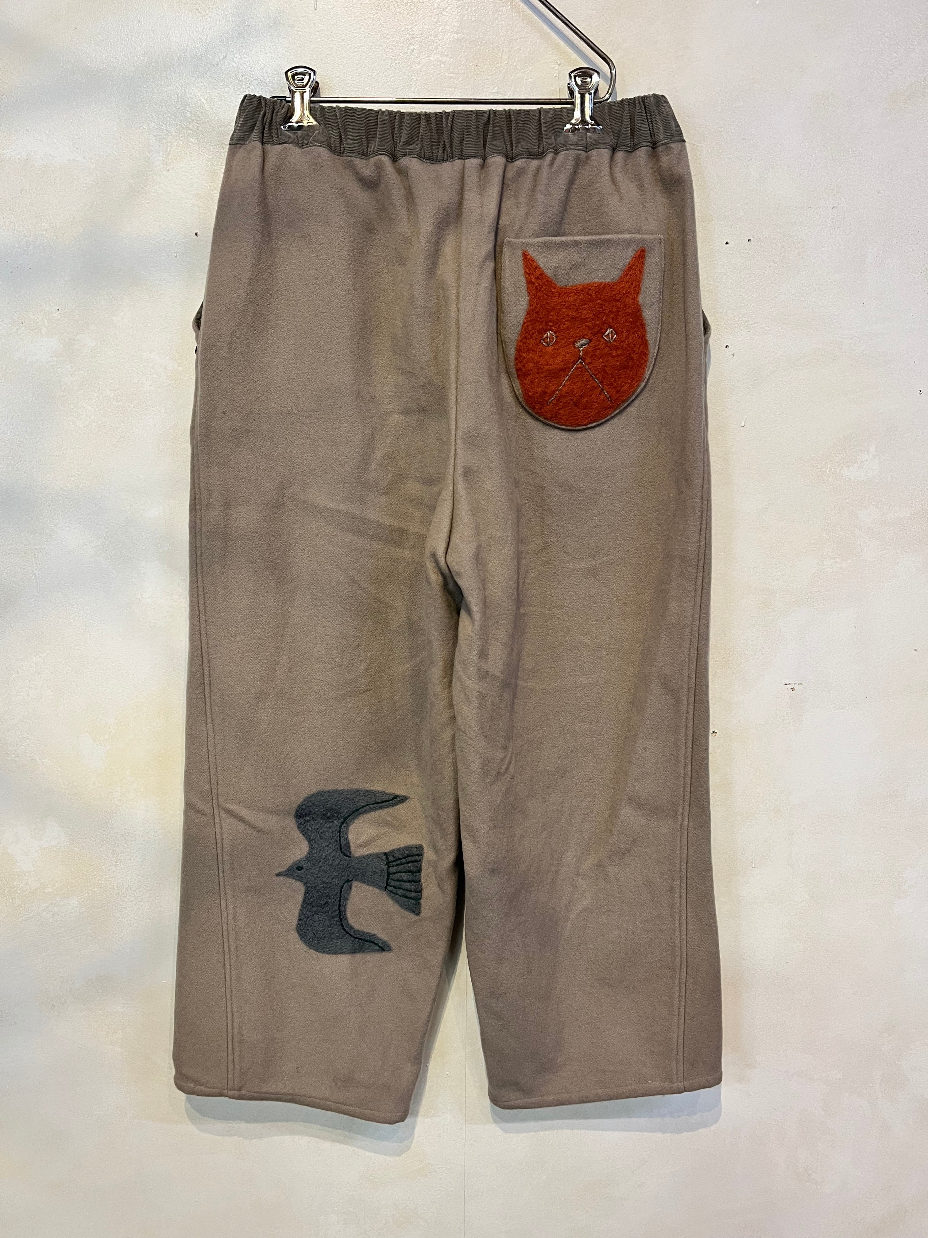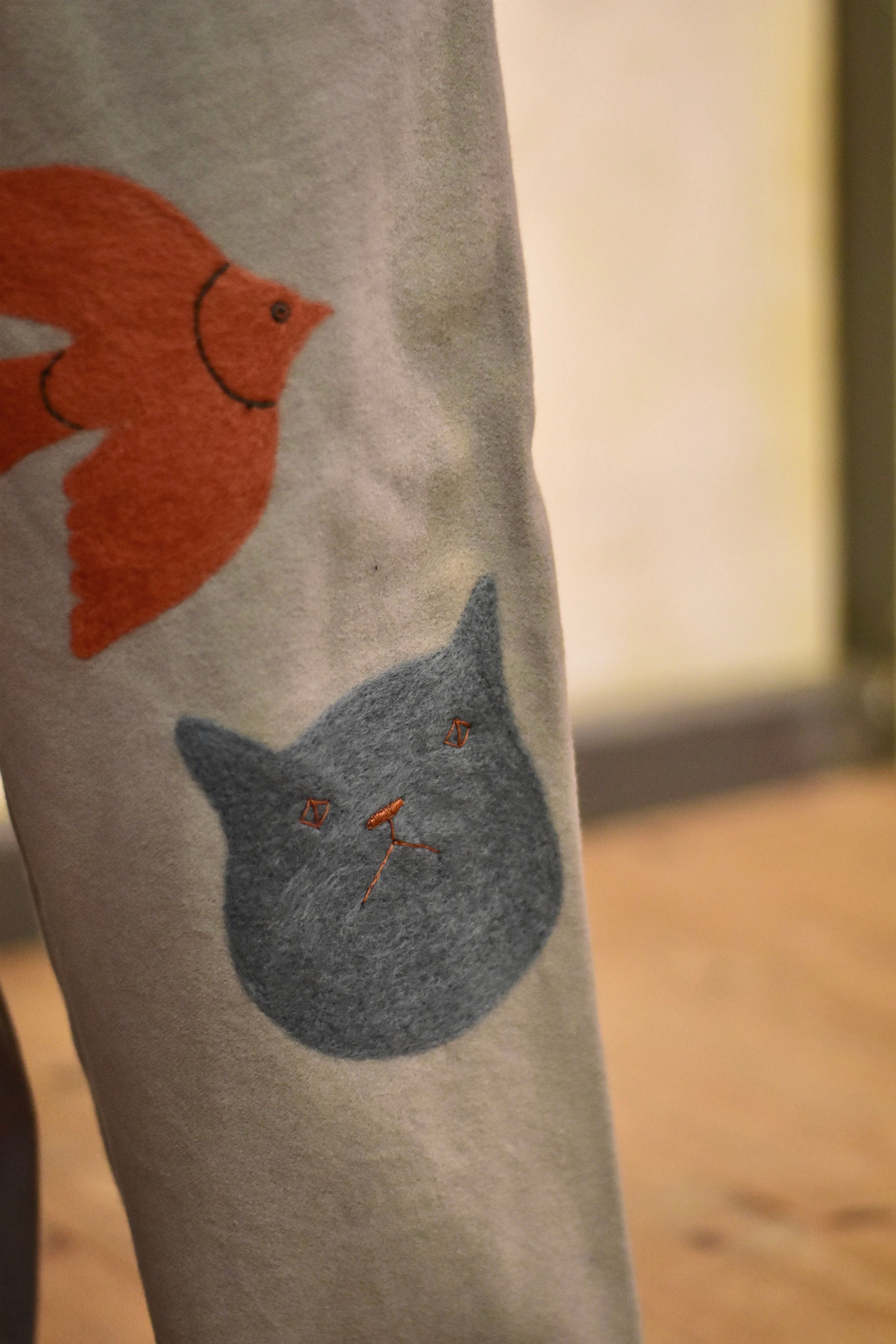 ふかふかとしたフェルト生地に、猫と鳥のイラストをフェルトで描いた、ワイドめストレートパンツです。